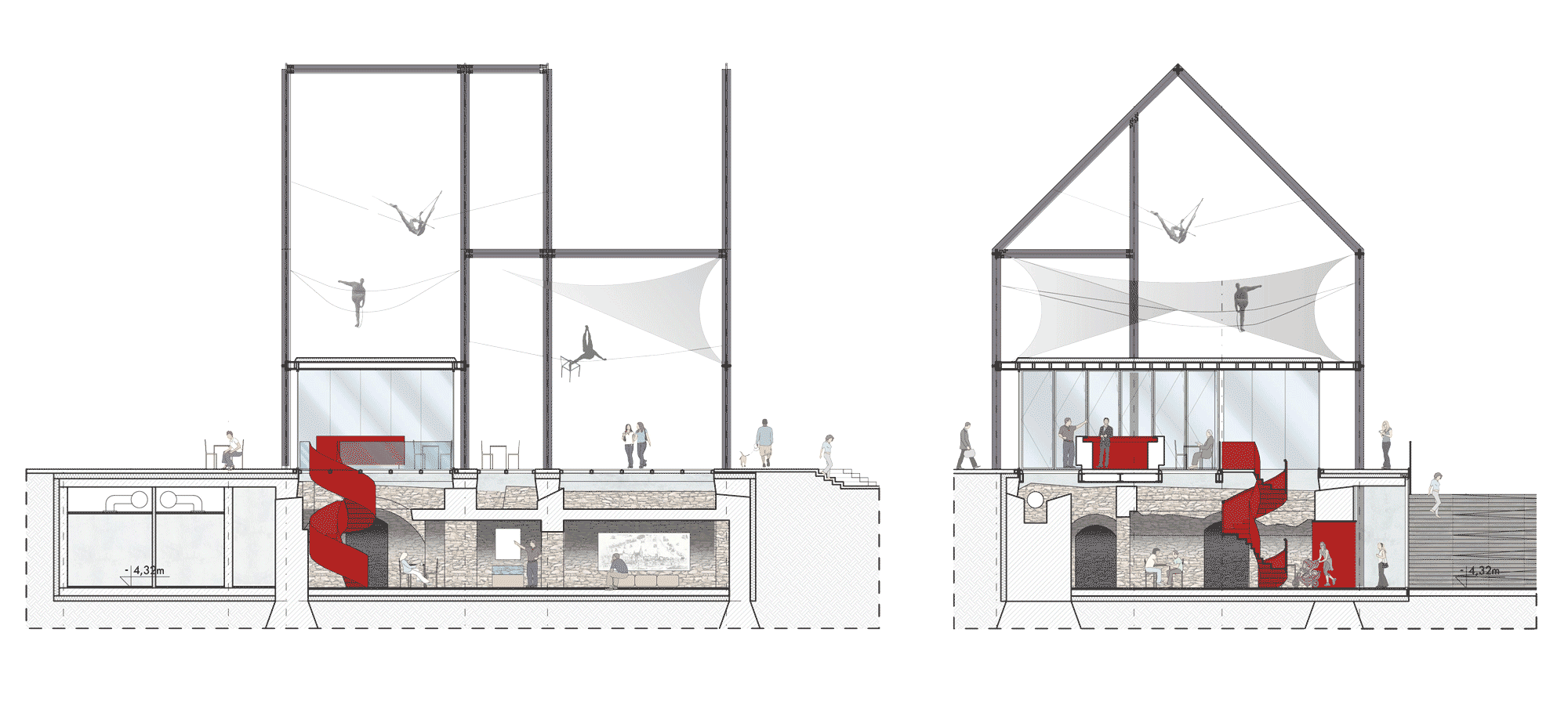 A very important element in the design is reviving the contour of the old town hall with a steel skeleton. The contour of the old town hall will serve as a new landmark for the old center, so that the past is visible ion a modern way and is also the place to display balancing sculptures. The archeological cellars are visible from the top due to glass floors and by excavating the southern part of the square, making it accessible and visible. The archeological exhibits, public toilets and facility areas are to be placed under the square. In the contour of one of the rooms of the old town hall a bar has been designed as a glass pavilion.
